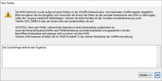 Dies hat zur Folge, dass die in der Hinweismeldung enthaltenen Detailinformationen von der Condition Waffenverwaltung nicht mehr gelesen werden können.