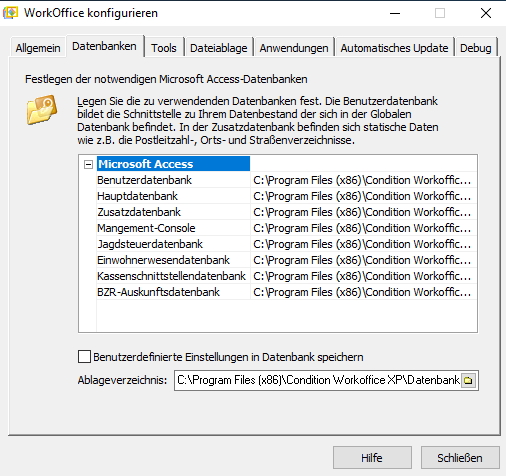 3. Wechseln Sie auf die Registerkarte “Datenbanken” und ändern Sie hier absteigend den Dateipfad für jede der in “C:\Program Files (x86)\Condition Workoffice XP\datenbank” gespeicherten Dateien auf den unter 1. angelegten Ordner.