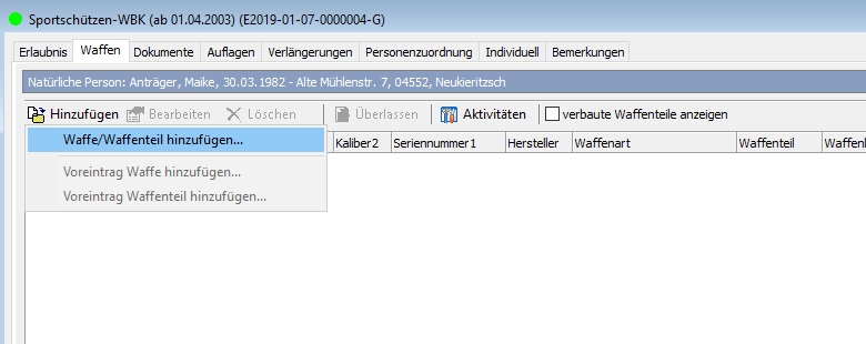 Öffnen Sie hierzu bitte die betroffene Waffenbesitzkarte und klicken Sie dann auf die Schaltfläche [Hinzufügen] – “Waffe/Waffenteil hinzufügen”.