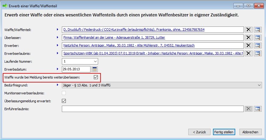 Person A erwirbt eine Waffe und überlässt diese nach 7 Tagen an Person B. Die Erwerbsmeldung von Person A erfolgt erst nach Überlassung der Waffe an Person B. Die zuständige Behörde für Person B hat die Waffe aber bereits über das NWR auf einer WBK eingetragen.