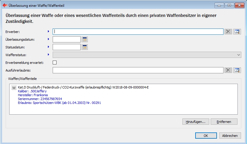 Suchen Sie die Waffe wie gewohnt über das Feld “Waffe/Waffenteil” innerhalb der Erwerbsaktivität. Passen Sie, wenn nötig, das Datenfeld “Überlasser” an, da dieses immer mit dem aktuellen Besitzer der Waffe vorbelegt wird.