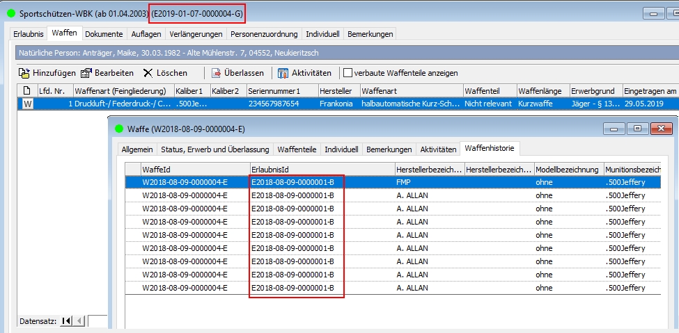 Vergleichen Sie nun die “ErlaubnisID” mit der NWR ID innerhalb der Titelleiste der geöffneten Waffenbesitzkarte. Diese sollten sich in dem hier beschriebenen Erfassungsszenario unterscheiden – wenn die Waffe bereits weiterüberlassen wurde.